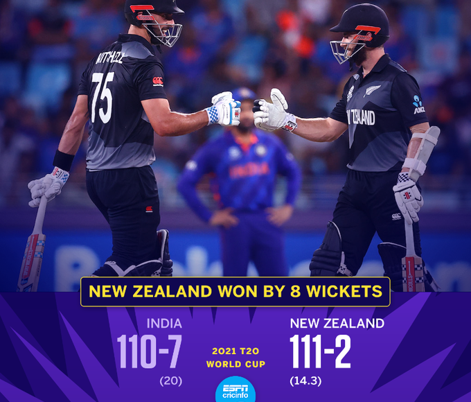 دبئي : ٽي ٽوئنٽي ورلڊ ڪپ جي گروپ 2 جي اهم ميچ ۾ نيوزيلينڊ جي ٽيم ڀارت کي 8 وڪيٽن جي وڏي مارجن تان شڪست ڏئي ڇڏي، جنهن کانپوءِ ڀارت جو ايندڙ مرحلي ۾ وڃڻ ڏکيو ٿي ويو آهي.