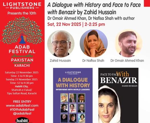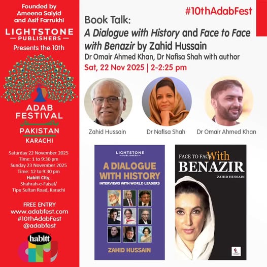 ساڳئي وقت ”زاهد حسين: اي ڊائلاگ وِد هسٽري اينڊ فيس ٽو فيس وِد بينظير“ تي نشست ٿي جنهن ۾ ڊاڪٽر عمير احمد خان ۽ ڊاڪٽر نفيسه شاهه مصنف سان سياسي منظرنامي تي ڳالهه ٻولهه ڪئي۔