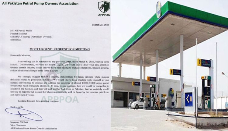 آل پاڪستان پيٽرول پمپ اونرز ايسوسيئيشن طرفان جاري ڪيل پڌرائي ۾ چيو ويو آهي ته ايسوسيئيشن پيٽروليم واري وزير علي پرويز ملڪ سان فوري ملاقات لاءِ خط اماڻي ڇڏيو آهي، 6 مارچ تي به خط اماڻيو ويو هو پر انهي جو اڃان تائين ڪوبه جواب نه مليو آهي.
